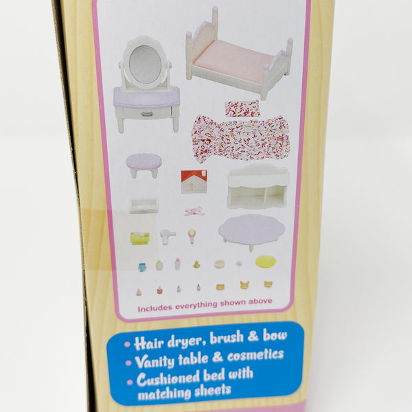 Cushioned bed, pillow, bedsheet, table, plate, 3 butter cookies, hair brush, jewelry box, vanity table with mirror and drawer, bench, hair dryer, cosmetics tray, 2 nail polish bottles, 2 lipsticks, 2 lotion bottles, 2 perfume bottles, powder case, powder puff, bow, storage case, mini cozy cottage